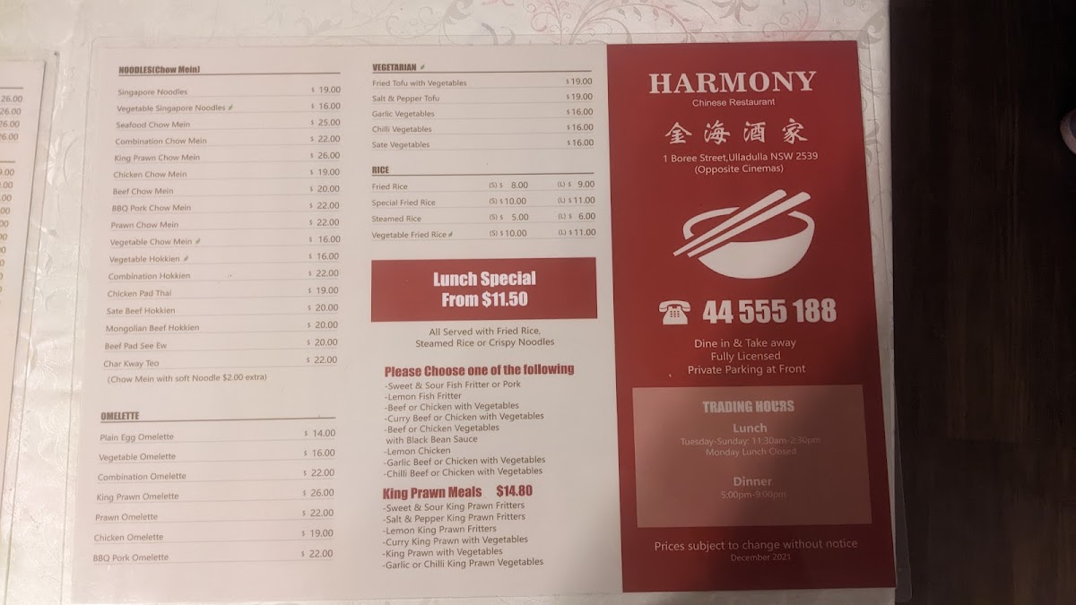 Welcome to Harmony Chinese Restaurant, a gem nestled in Ulladulla, NSW. This inviting eatery offers a diverse menu that showcases traditional Chinese flavors with a modern touch. From the moment you step inside, you're greeted with the tantalizing aromas of their exquisite dishes.